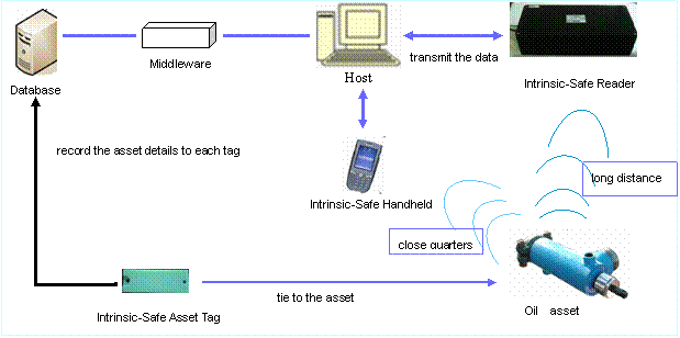(4) Track the life-cycle use of oil assets, log the asset maintenance history by handheld RFID reader from New Asset imported to expire. The real time log and acquire of asset maintenance history by RFID largely reduces the high labor cost (staff have to log the assets maintenance history into data center by mandate input according to the asset label records) and promote the timeliness of information input without any delay.